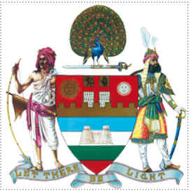 The motto is Let there be Light. The badge is a peacock, the sacred bird of Rajputana, standing on a two edged, two handed Rajput Sword Khanda.